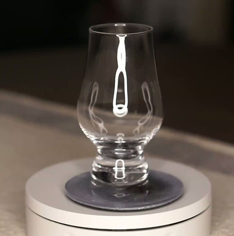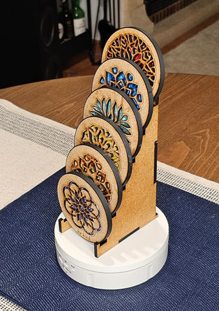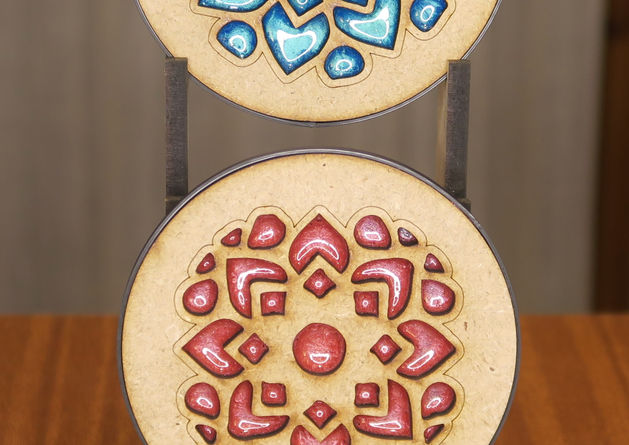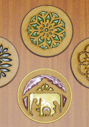 Juego de 6 posavasos en madera, cortados con láser, pintados en resina y mica con base expositora.